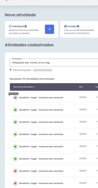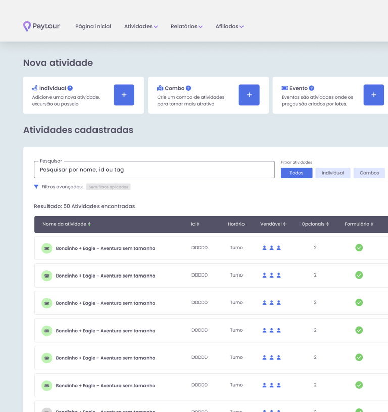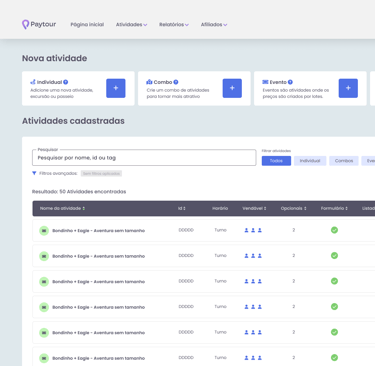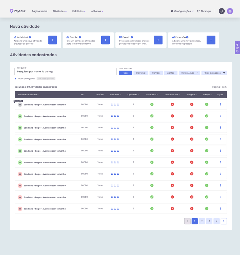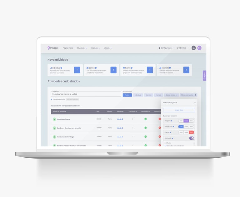 O cadastro e a listagem de atividades são peças fundamentais para os lojistas dentro do Paytour. No entanto, a versão anterior apresentava desafios: a navegação era pouco intuitiva, os filtros poluíam a tela e o fluxo de cadastro não era tão fluido quanto poderia ser. Era preciso uma solução que trouxesse mais clareza e praticidade.